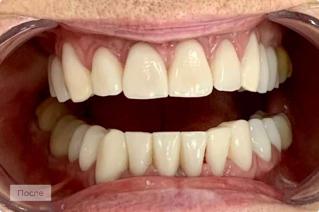 Были изготовлены виниры из материала Е-Мах (Германия). Пациент остался доволен результатом: улыбка выглядит эстетично.