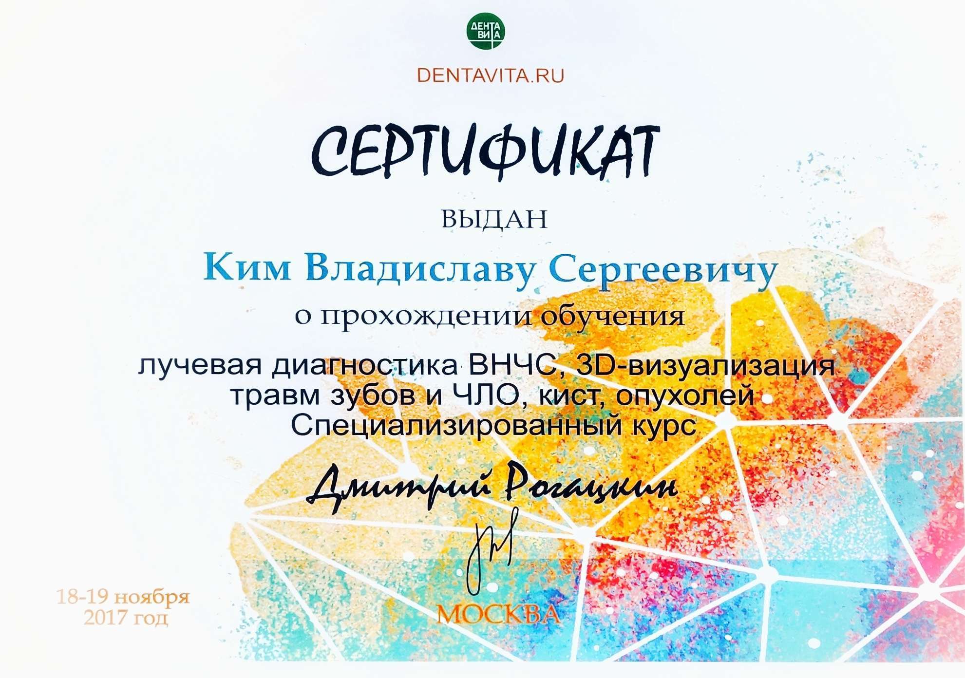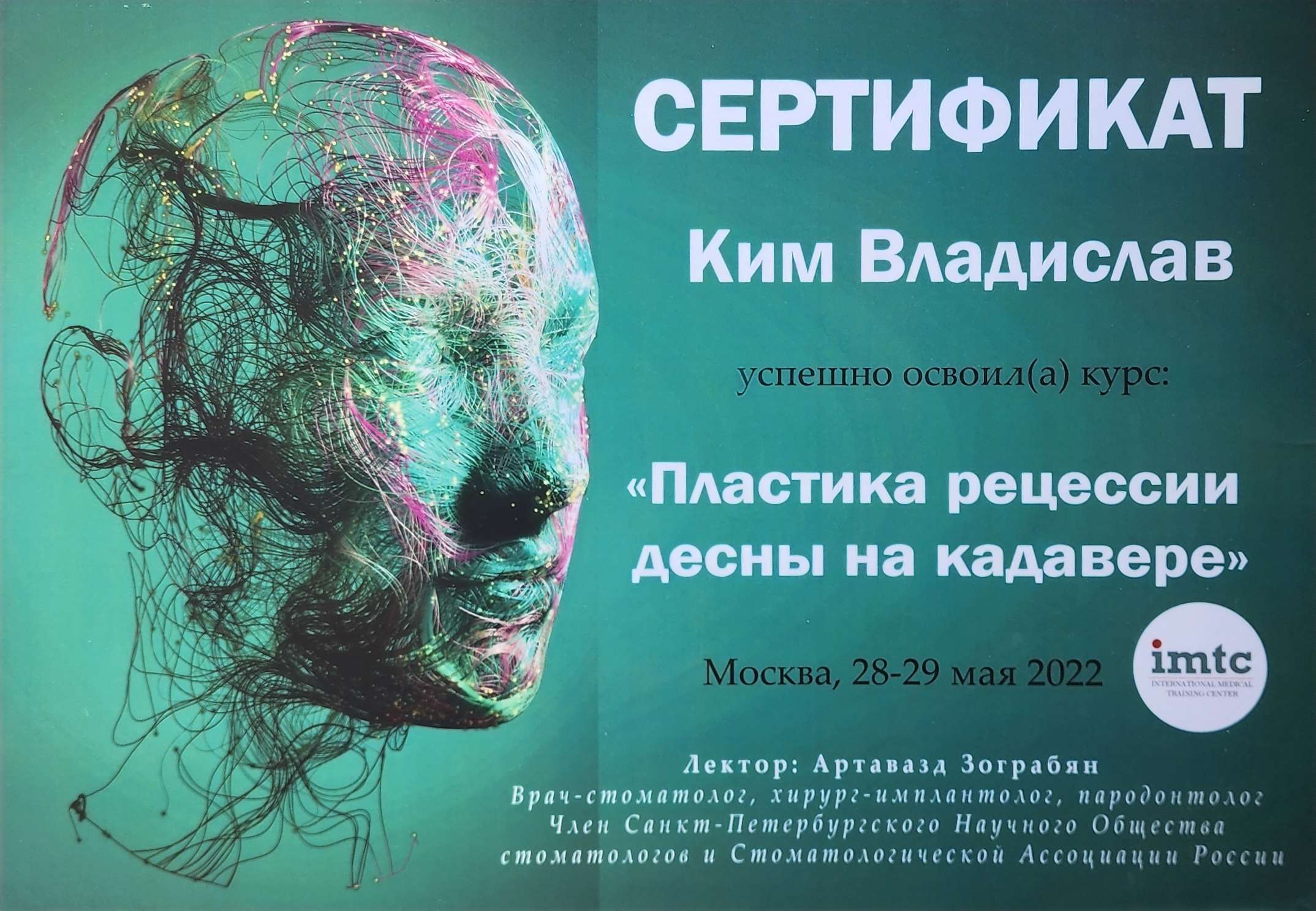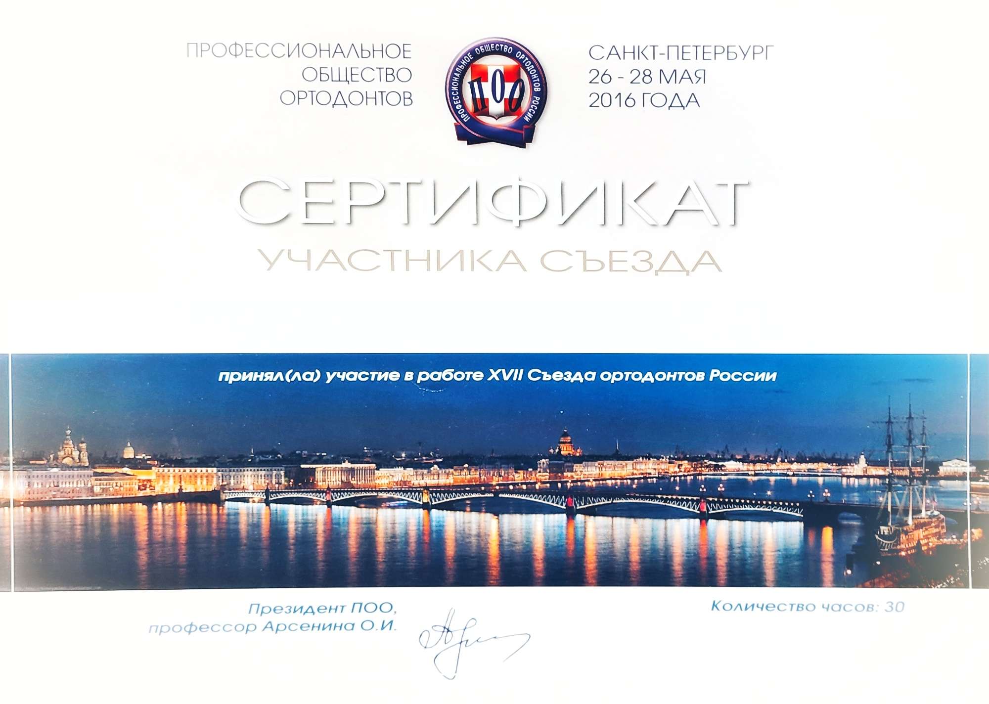 - 2015-2017 Ординатура на кафедре клинической стоматологии и имплантологии федерального государственного бюджетного образовательного учреждения дополнительного профессионального образования России, по специальности врач ортодонт